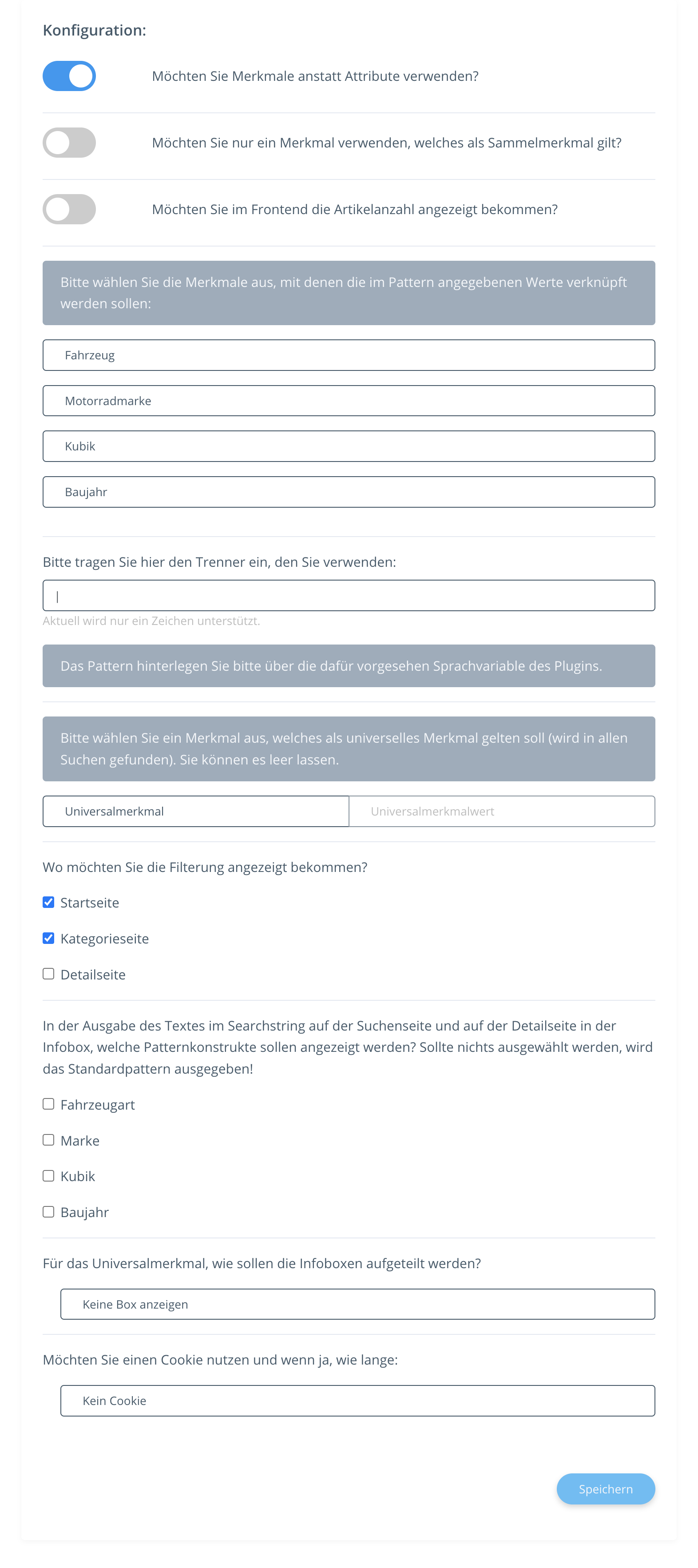 Im ersten Block der Konfiguration sind allgemeine Entscheidungen zu treffen, zunächst, soll ein Funktionsattribut oder aber sollen Merkmale für die Filterung genutzt werden? Darüber hinaus ist hier thematisch die Frage angesiedelt, ob die Artikelanzahl mit angegeben werden soll, oder aber ob sie ausgeblendet werden soll, sowie, wenn Merkmale gewählt sind, besteht die Möglichkeit zu wählen, ob für jeden Patterneintrag je ein Merkmal genutzt werden soll, oder aber ob ein "Sammelmerkmal" genutzt werden. Letzteres wird auch in der Detailansicht ausgeblendet.